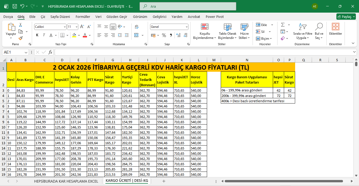 - Ürün desisi / KG: Desi/KG girince kargo maliyeti otomatik hesaplanır.