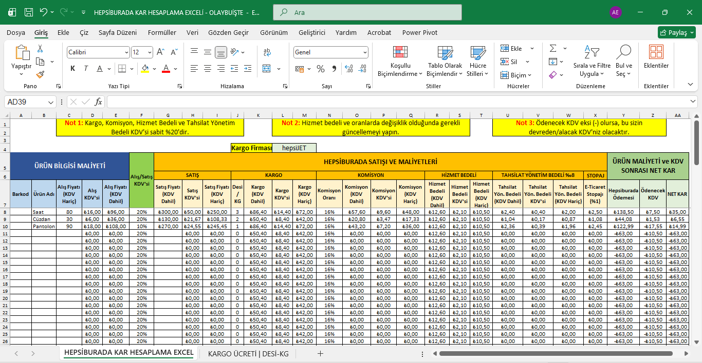 Hepsiburada’da tek tek ürün hesabı yapmak kolay; zor olan çok ürünün kârlılığını aynı mantıkla, hızlıca kıyaslayabilmek. Bu Excel şablonu; ürün satırlarını toplu girip net kârı ve kesintileri tek tabloda görmen için hazırlandı.